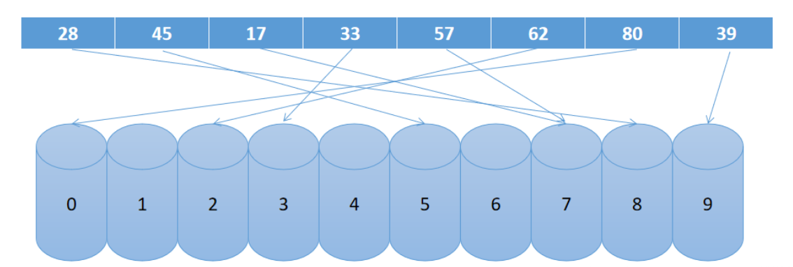 eg: 待排序的数为: 28,45,17,33,57,62,80,39,按其个位数分别放入对应的桶里,如下图所示: