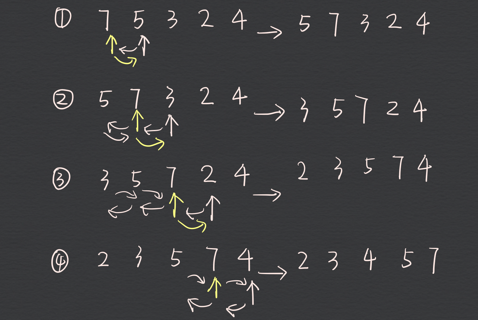 b、如果第二个数据比第一个小,则交换。然后在用第三个数据比较,如果比前面小,则插入(狡猾)。否则,退出循环