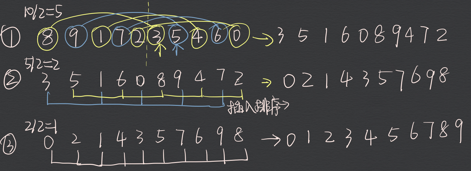 c、说明:基本原理和插入排序类似,不一样的地方在于。通过间隔多个数据来进行插入排序。