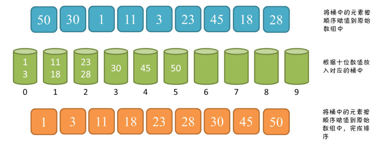 桶排序的扩展:以整数排序为例,主要思想是将整数按位数划分,准备 10 个桶,代表 0 - 9,根据整数个位数字的数值将元素放入对应的桶中,之后按照输入赋值到原序列中,依次对十位、百位等进行同样的操作,最终就完成了排序的操作。