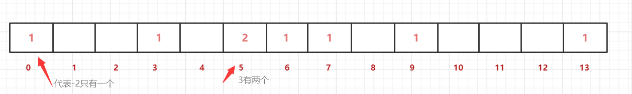 1. 计数数组长度:len = max -min +1=11-(-2) +1=14
