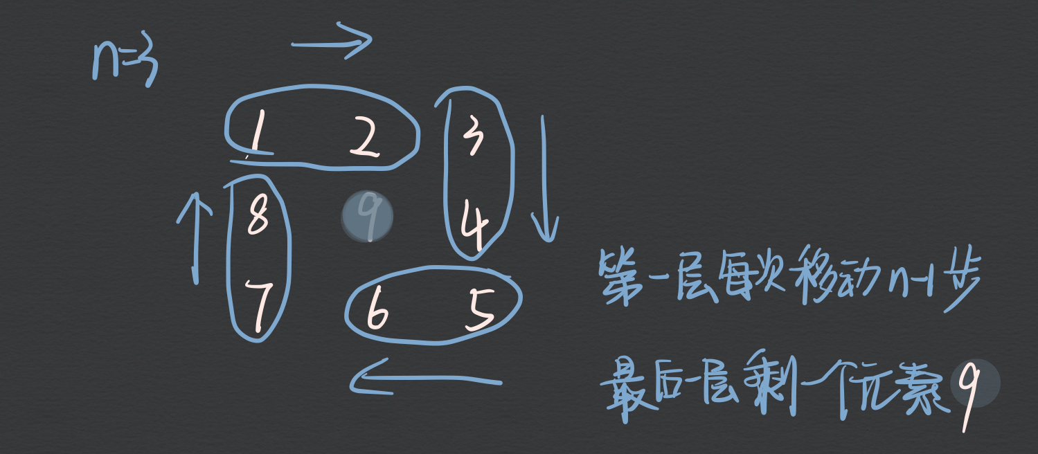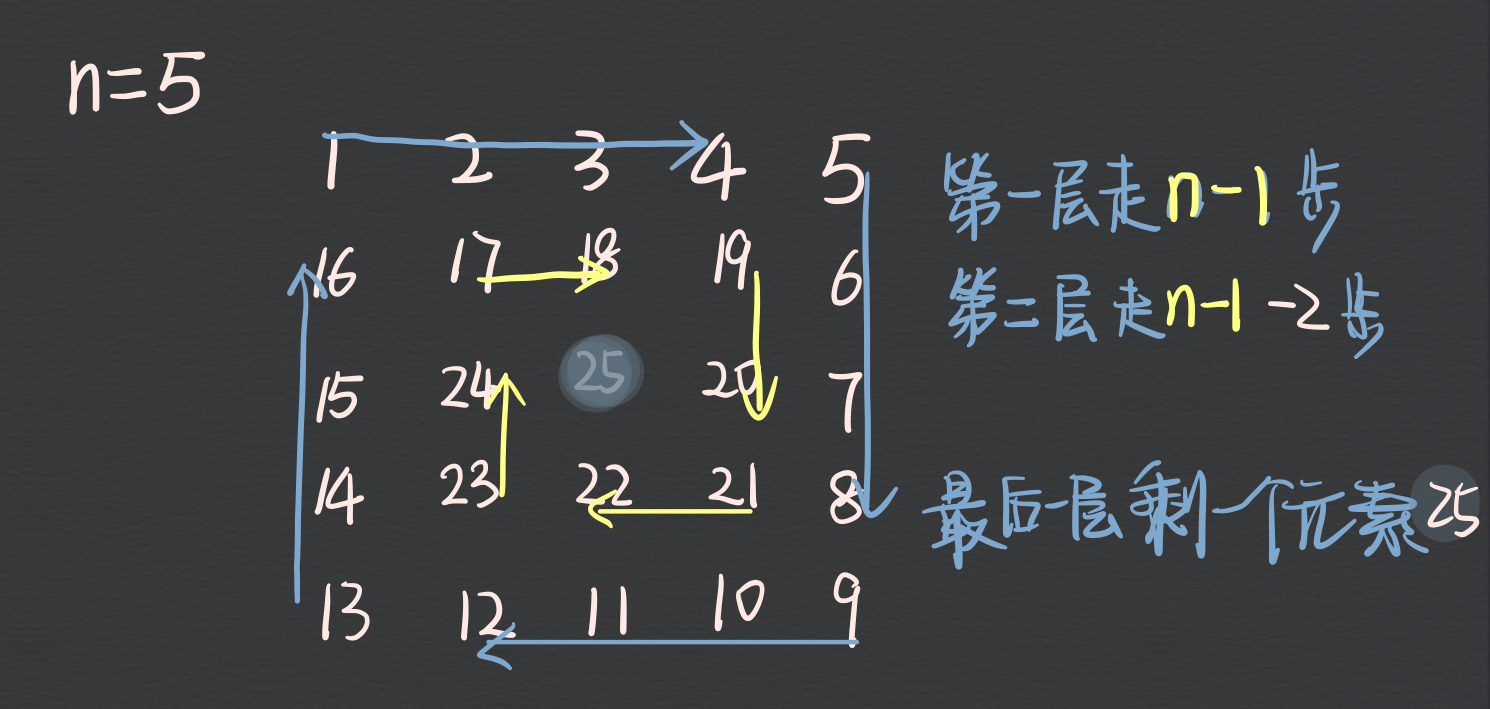 1.n 为奇数时,最里层总会剩下元素没有填充;