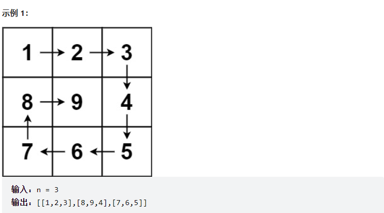题目描述:给你一个正整数 n ,生成一个包含 1 到 n x n 所有元素,且元素按顺时针顺序螺旋排列的 n x n 正方形矩阵 matrix 。
