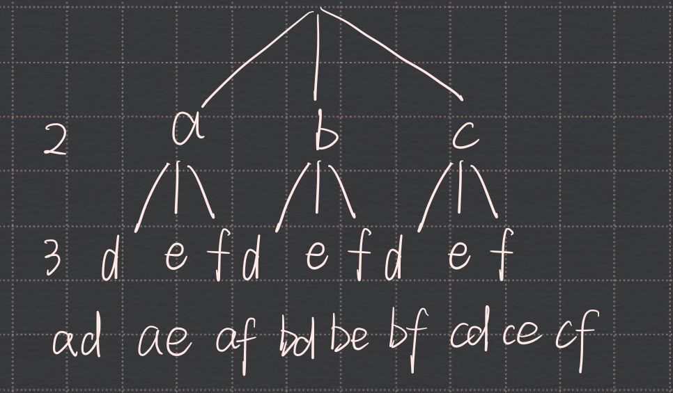 输出:["ad","ae","af","bd","be","bf","cd","ce","cf"] |