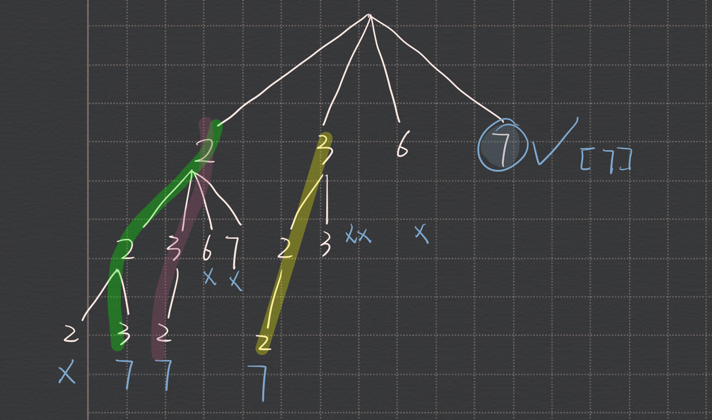 2 和 3 可以形成一组候选,2 + 2 + 3 = 7 。注意 2 可以使用多次。 | |